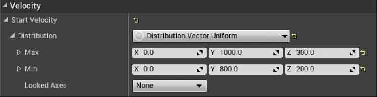 如图3-150所示,选中Start Velocity初始速度模块,案例中将最大速度Max的数值分别设置为0、1000、300,最小速度Min的数值分别设置为0、800、200,从数值中可以看出主要速度表现在Y轴使箭横向射出,速度上有200个单位区间的变化。Z轴数值是使箭向斜上方飞行。