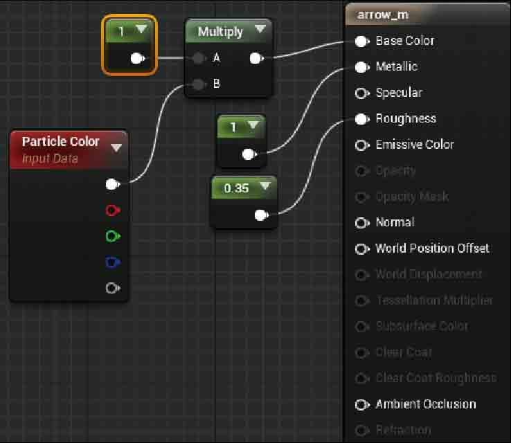 如图3-140所示,在材质编辑窗口中建立常量(键盘数字1)并赋值为1,建立Particle Color粒子颜色表达式,将Particle Color的RGB通道与常量表达式进行乘法运算,乘法结果连接到材质Base Color基本颜色通道。要把箭作为粒子发射器的粒子,就需要添加Particle Color表达式使用粒子颜色模块来控制材质颜色。