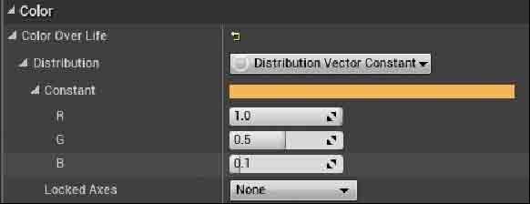 如图3-151所示,单击Color Over Life模块,将Color Over Life数据输入类型类型改为“固定常量类型”,打开Constant属性的R、G、B通道,数值分别设置为1、0.5、0.1,让粒子体呈金黄色。