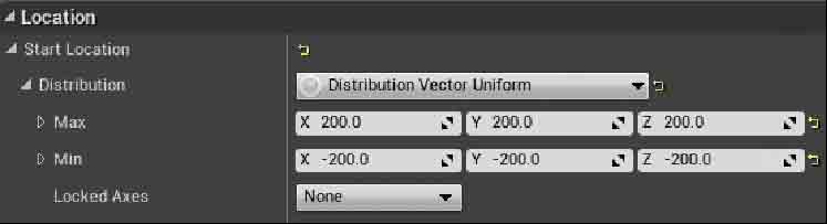 单击Start Location模块,在属性窗口中将坐标最大位移Max的X、Y、Z数值全部设置为200,最小位移Min的X、Y、Z数值全部设置为-200,如图3-153所示。