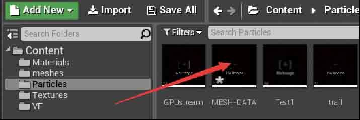 如图3-143所示,把模型拖到场景编辑窗口中观察,材质光照和反射已经有些感觉了。如图3-144所示,在引擎主面板资源浏览窗口Content目录Particles文件夹中建立一个新的粒子系统,将这个粒子系统命名为MESH-DATA。双击粒子系统图标进入编辑窗口。