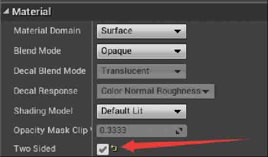 双击arrow_m材质球图标打开材质编辑器,给箭制作材质。进入材质编辑面板,会看到一个默认的四维矢量,删除它。鼠标左键单击材质,在属性窗口中将“双面显示”选项勾上,如图3-139所示。