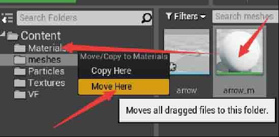 如图3-138所示,选中这个材质球,按功能键F2将它重命名,案例中命名为arrow_m。命名完成,单击鼠标左键拖动这个材质球到资源浏览窗口左侧Materials文件夹上松开鼠标,弹出菜单选择Move Here,把这个材质球转移到存放材质的文件夹中。