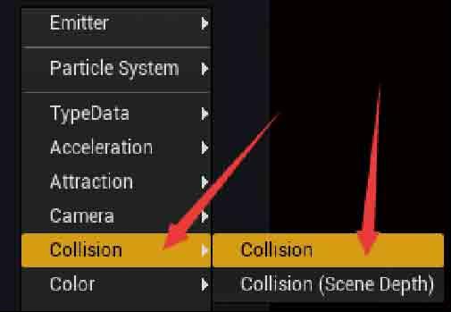 打开粒子编辑面板,在发射器中添加一个碰撞检测模块。在发射器模块区空白处单击鼠标右键,如图3-158所示,找到Collision命令,添加Collision碰撞模块。选中Collision模块,在属性窗口中打开Max Collisions下拉属性栏。