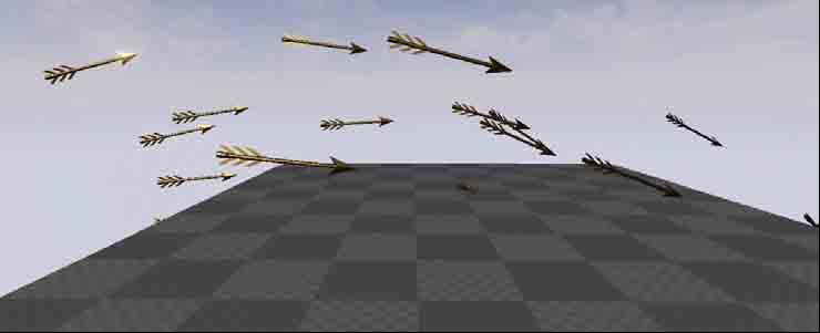 游戏中经常能看到一些效果,例如万箭齐发这种类型的技能,技能释放时有很多支箭从天而降,每支箭都有不同的移动轨迹。在虚幻引擎中制作这个技能通常就会使用到粒子系统Mesh Data。