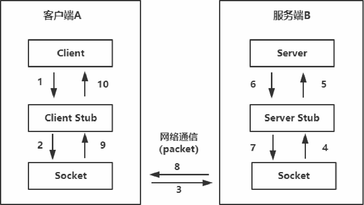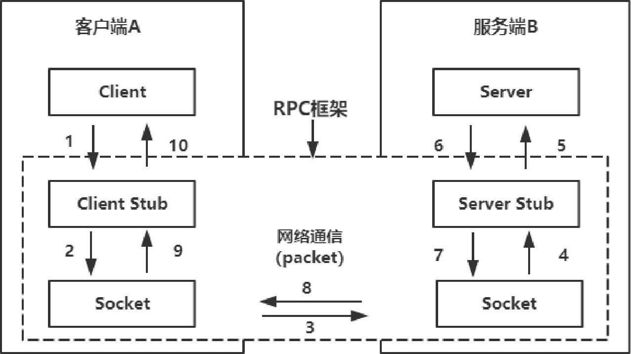 无论是哪种类型的数据,最终都需要转换成二进制流在网络上进行传输,数据的发送方需要将对象转换为二进制流,而数据的接收方则需要把二进制流再恢复为对象。RPC的目标是把(2)、(3)、(4)、(7)、(8)、(9)这些步骤都封装起来,具体如图3-3所示。