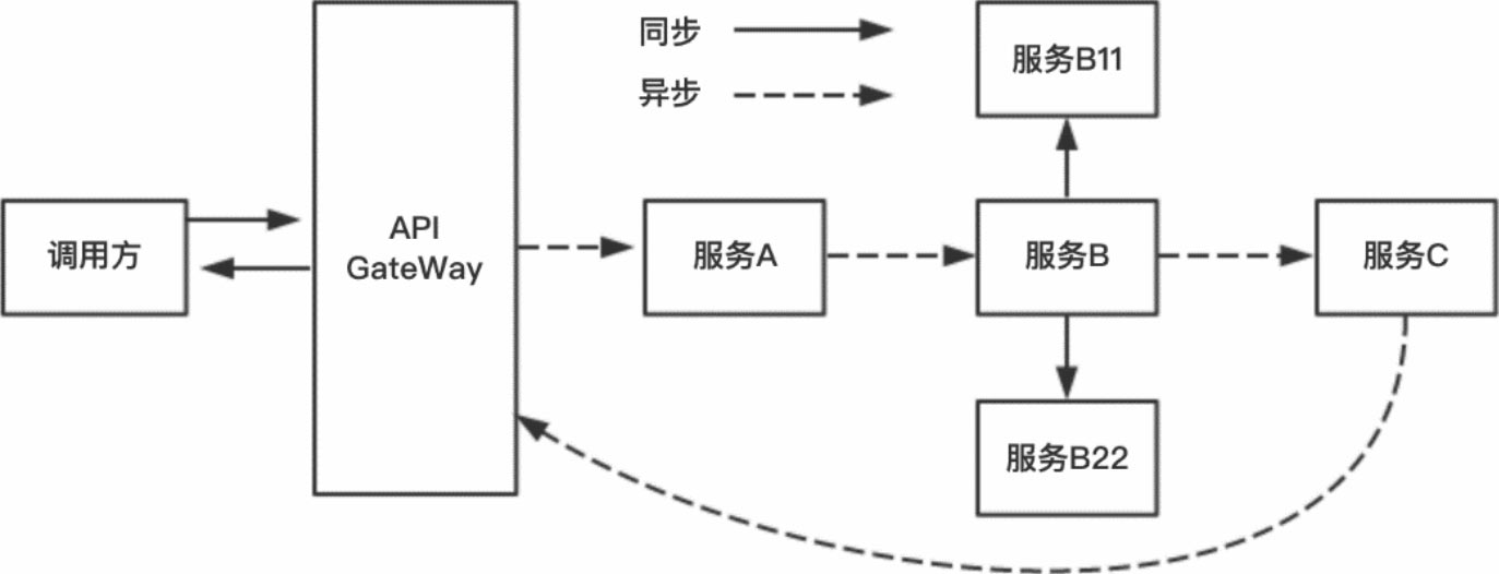 调用方通过服务网关(API Gateway)发起调用并等待结果,随后网关派发调用请求给后续服务,其主调用链路为A-B-C,其内部为异步调用,链路上不等待,最后由C返回结果给服务网关。其中,B又依赖两个子服务:B11和B22,B需要B11和B22的返回结果才能发起C调用,因此在支线上B针对B11和B22调用就需要是同步的。