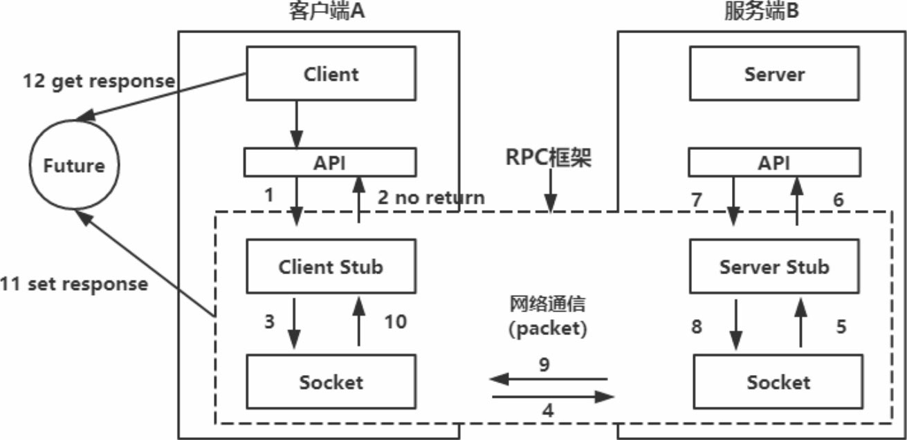 RPC的异步调用意味着RPC框架不阻塞调用方线程,调用方不需要立刻拿到返回结果,甚至调用方根本就不关心返回结果。RPC的异步交互场景如图3-4所示。