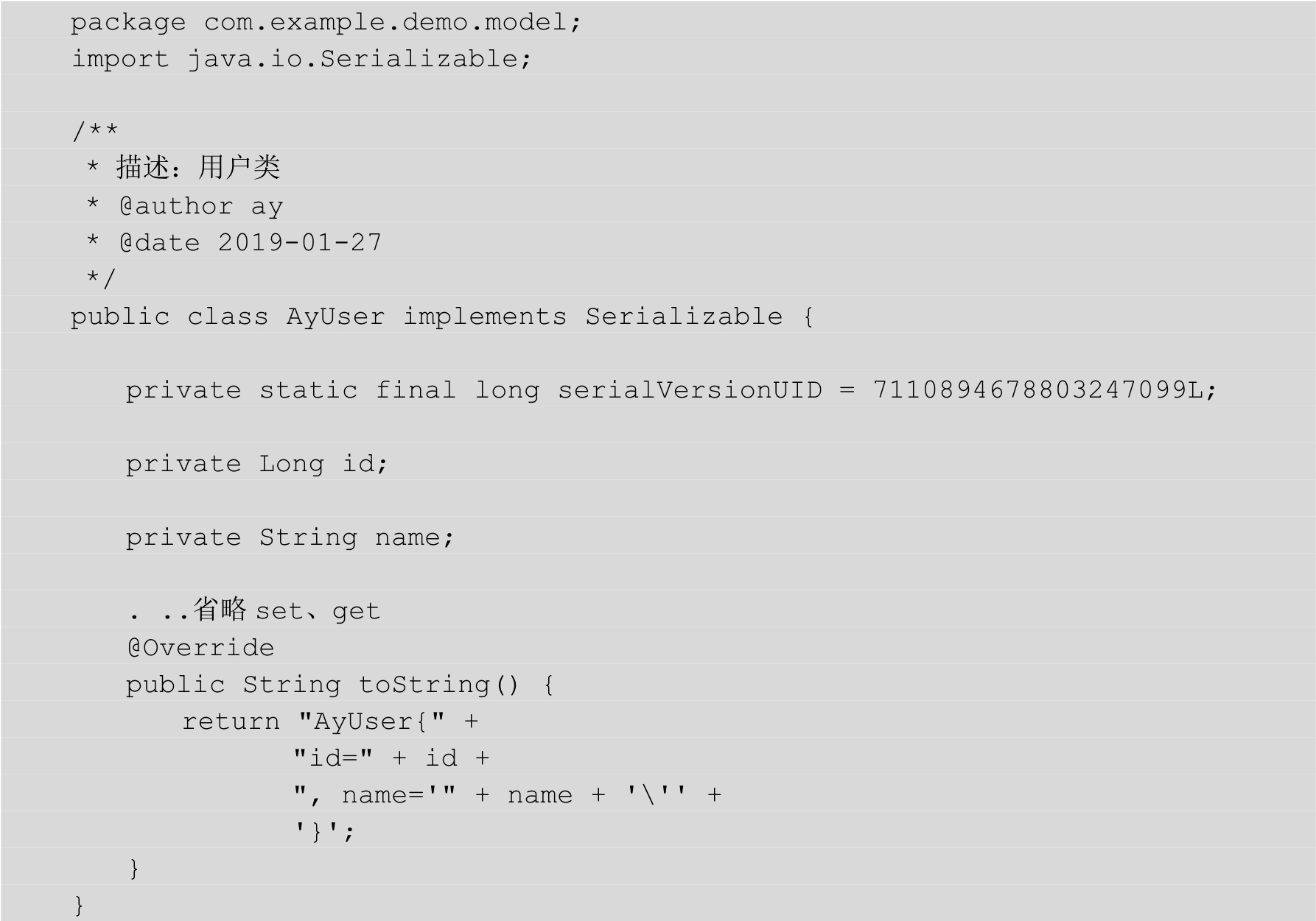 步骤01 定义AyUser对象,并实现Serializable接口,具体代码如下所示: