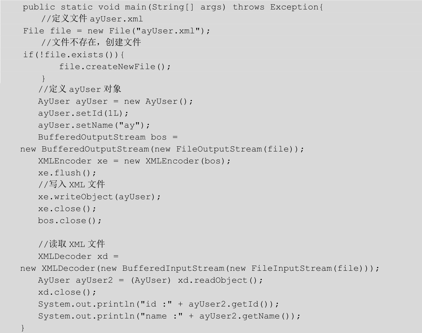 Java自带的XML序列化和反序列化主要使用XMLEncoder和XMLDecoder类实现相应的功能,具体实例如下所示: