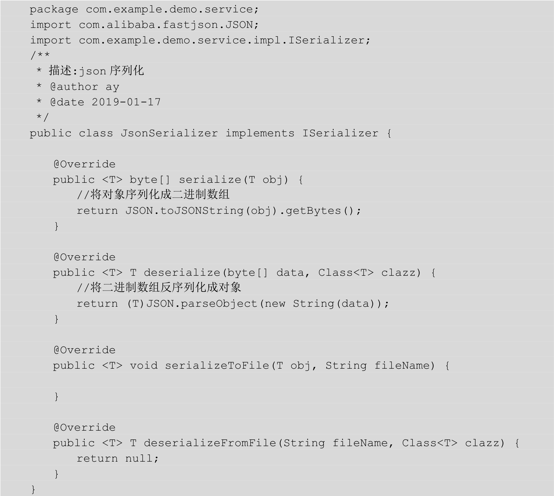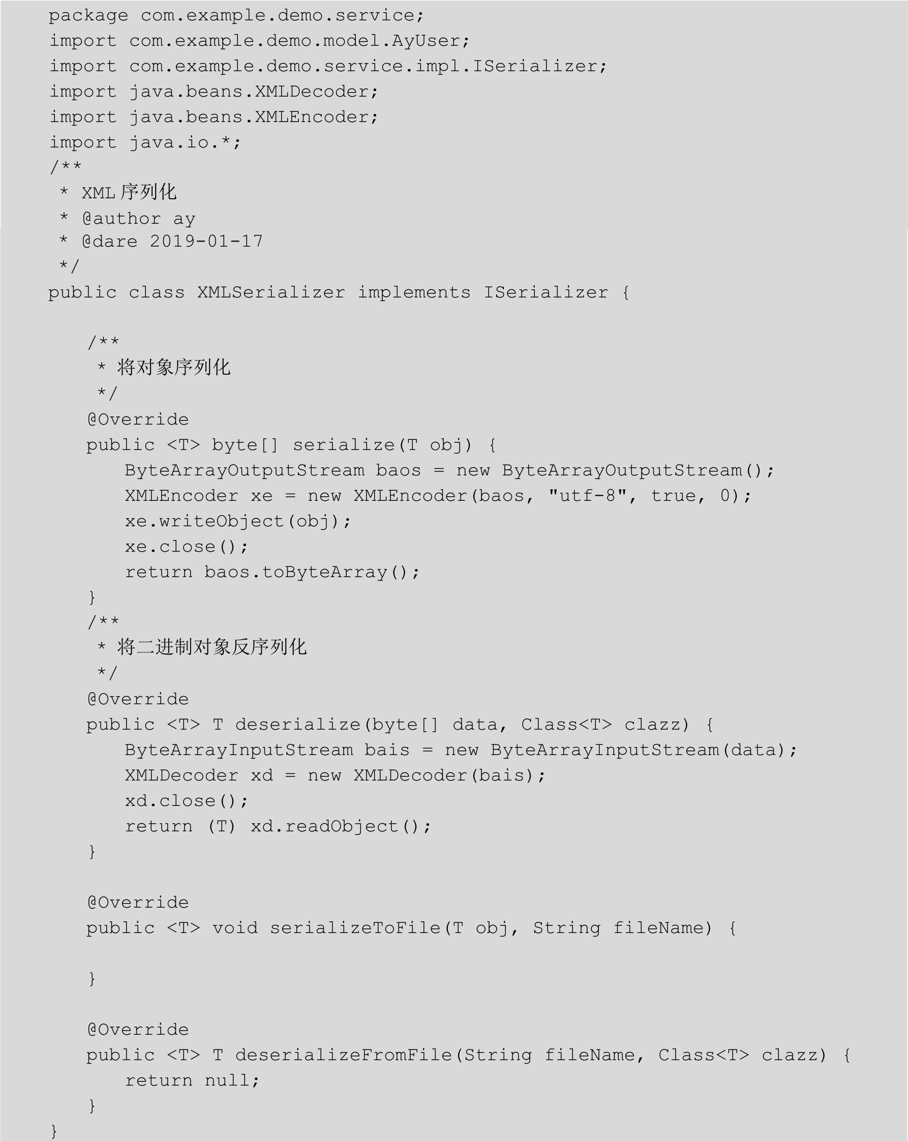 步骤03 实现序列化接口ISerializer,同时实现serialize、deserialize、serializeToFile和deserializeFromFile方法,具体代码如下所示: