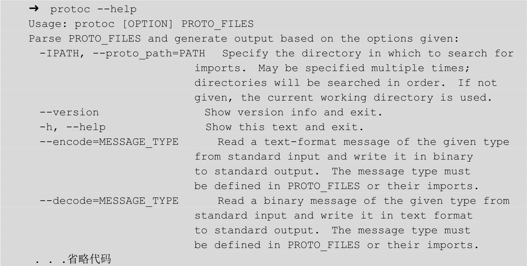 我们还可以在终端输入protoc --help命令查看protoc命令更多信息,具体代码如下所示: