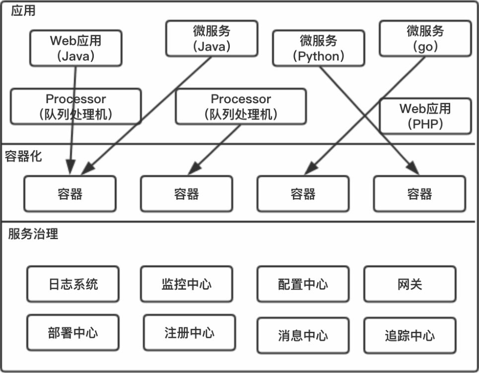 应用层:在应用层中主要相关的业务服务有用户服务、订单服务、产品服务等,各个微服务由不同的开发团队管理,每个团队可以选择适合自己业务开发的语言和技术框架,开发语言如Java、Go、PHP,技术架构如目前流行的微服务脚手架Spring Boot。