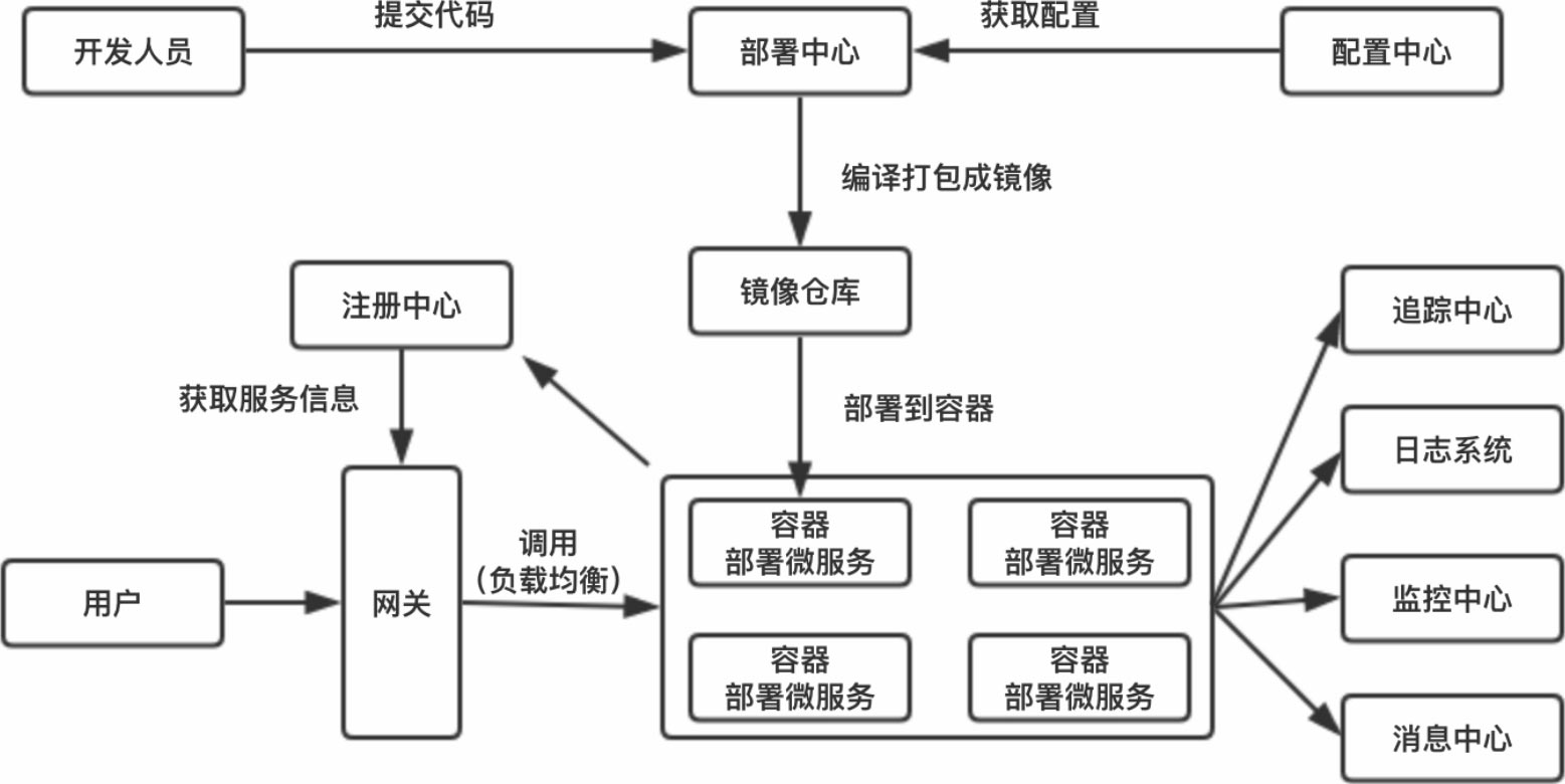 图1-6只是简单列举微服务中重要的组成部分,企业中用的技术更为复杂,其他子系统更为繁多。
