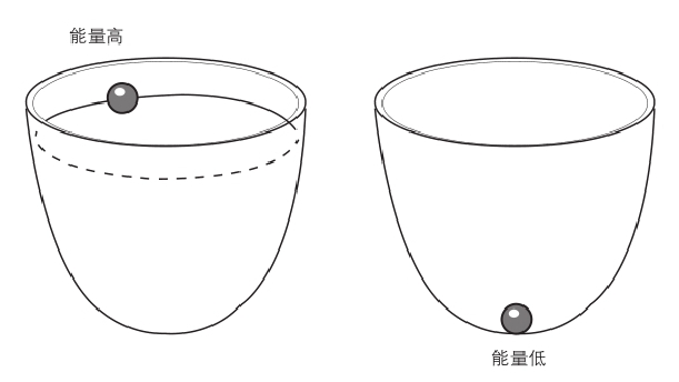图1.4 若不受外界干扰,系统(甚至是简单到只包含一颗弹珠和一只大碗的“系统”)会倾向落入最小能量与最大熵的状态——前提是没有外来的能量。