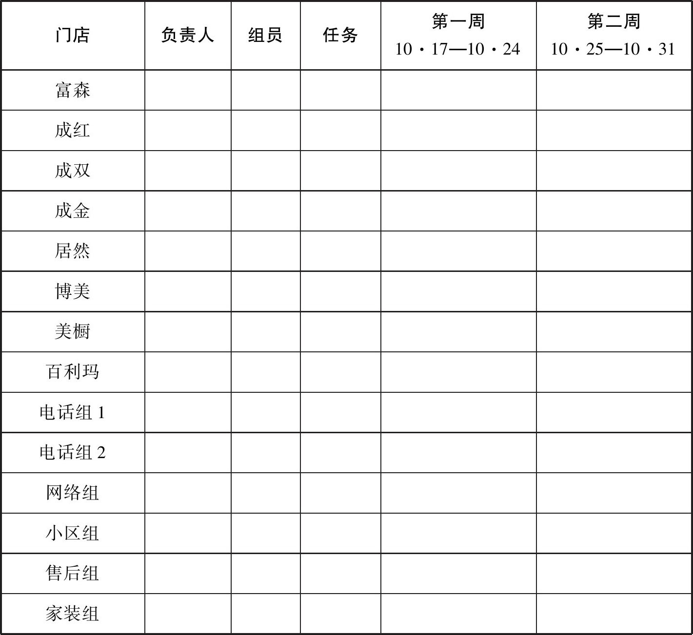 阶段一:10月17日—10月24日,富森任务27张,成红任务18张,成双任务18张,成金任务10张,居然任务8张,博美任务4张,美橱任务6张,百利玛任务4张;小区8张;家装9张;平面1张;网销1张;行政4张;安装1组11张;安装2组8张;电话营销组80张。