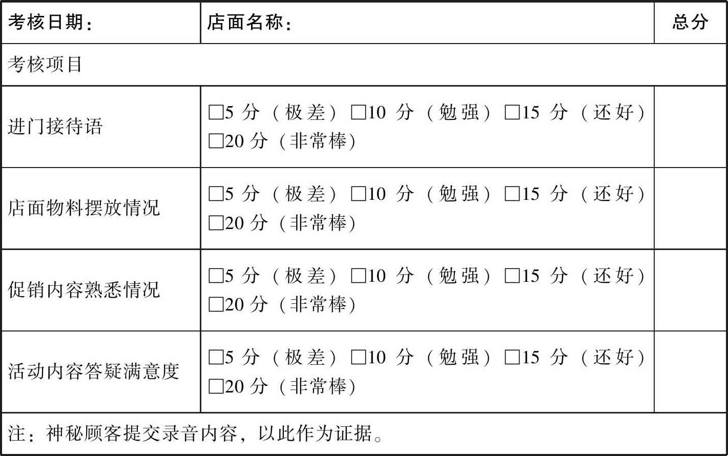 ③监督机制。神秘顾客考核表,如表4-8所示(由公司指派专人巡查)(冯、王)。