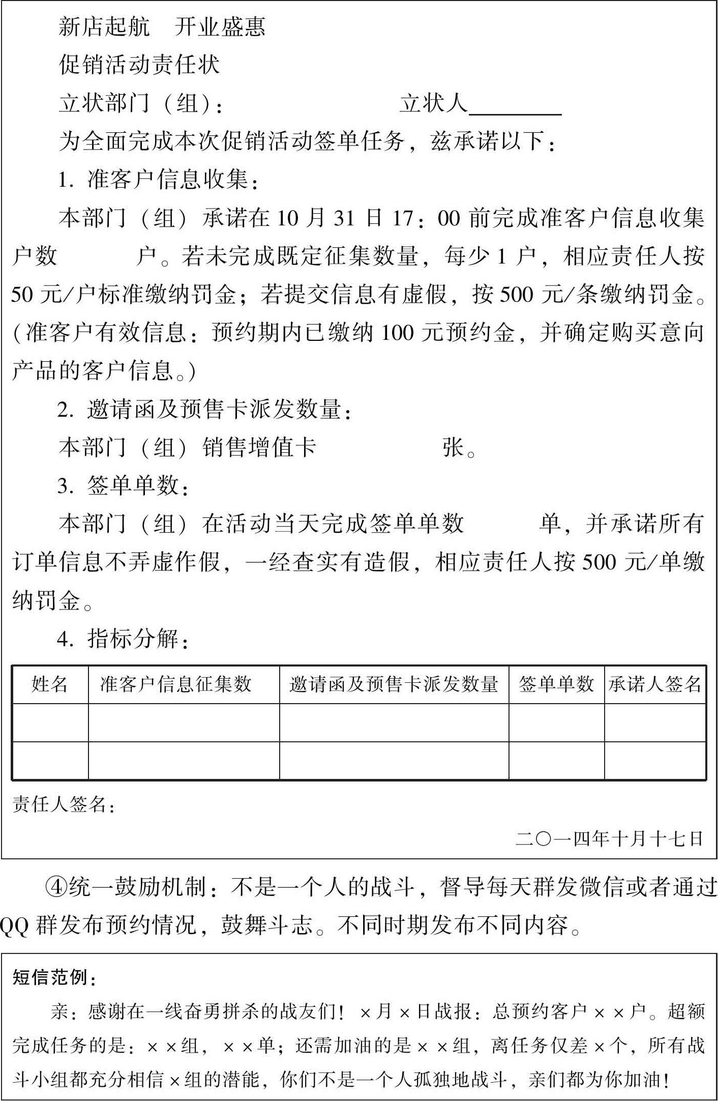 电话营销是向目标客户以打电话或发短信的方式传递活动信息。利用《电话营销跟踪明细表》(如表4-16所示)对客户进行跟踪,并将内容详细记录,经过分析分成3类客户:A类为本次意向客户;B类为下次意向客户;C类为无效客户。最终建立信息库,如表4-17所示,便于下次活动的营销。(具体见《成都开业活动话术》)
