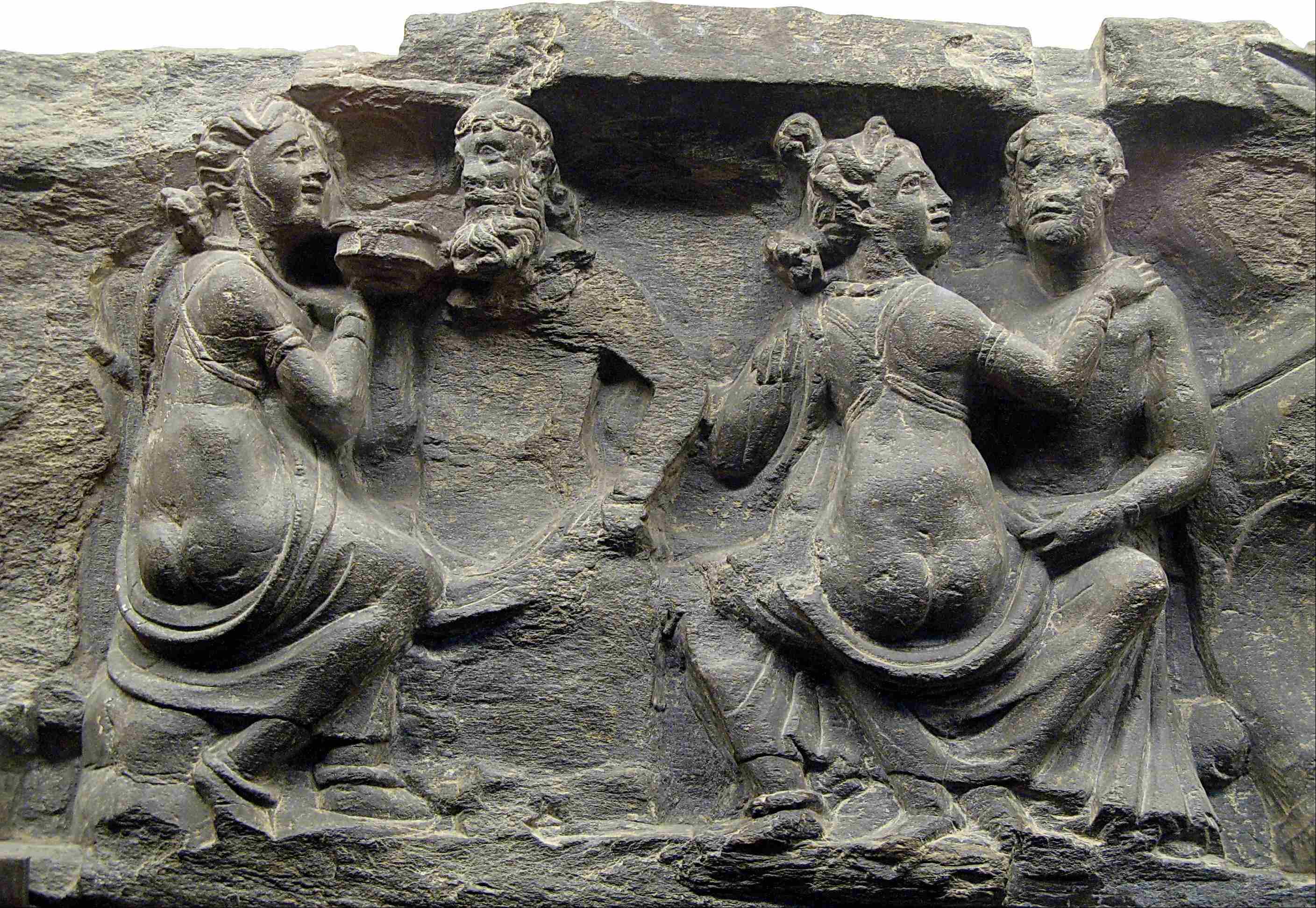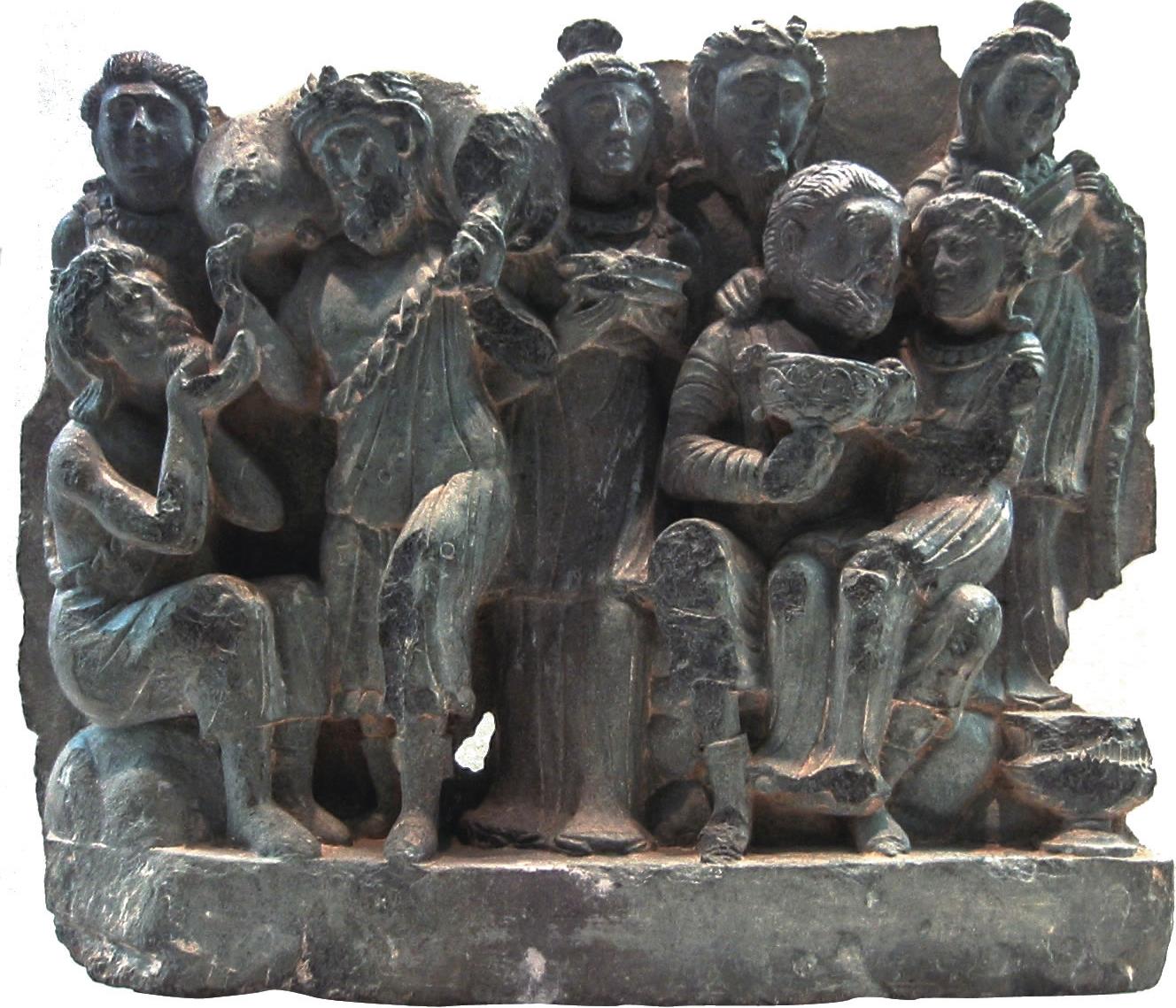图1-28 宴饮场面,1—2世纪,塔赫特巴希佛教遗址出土,大英博物馆