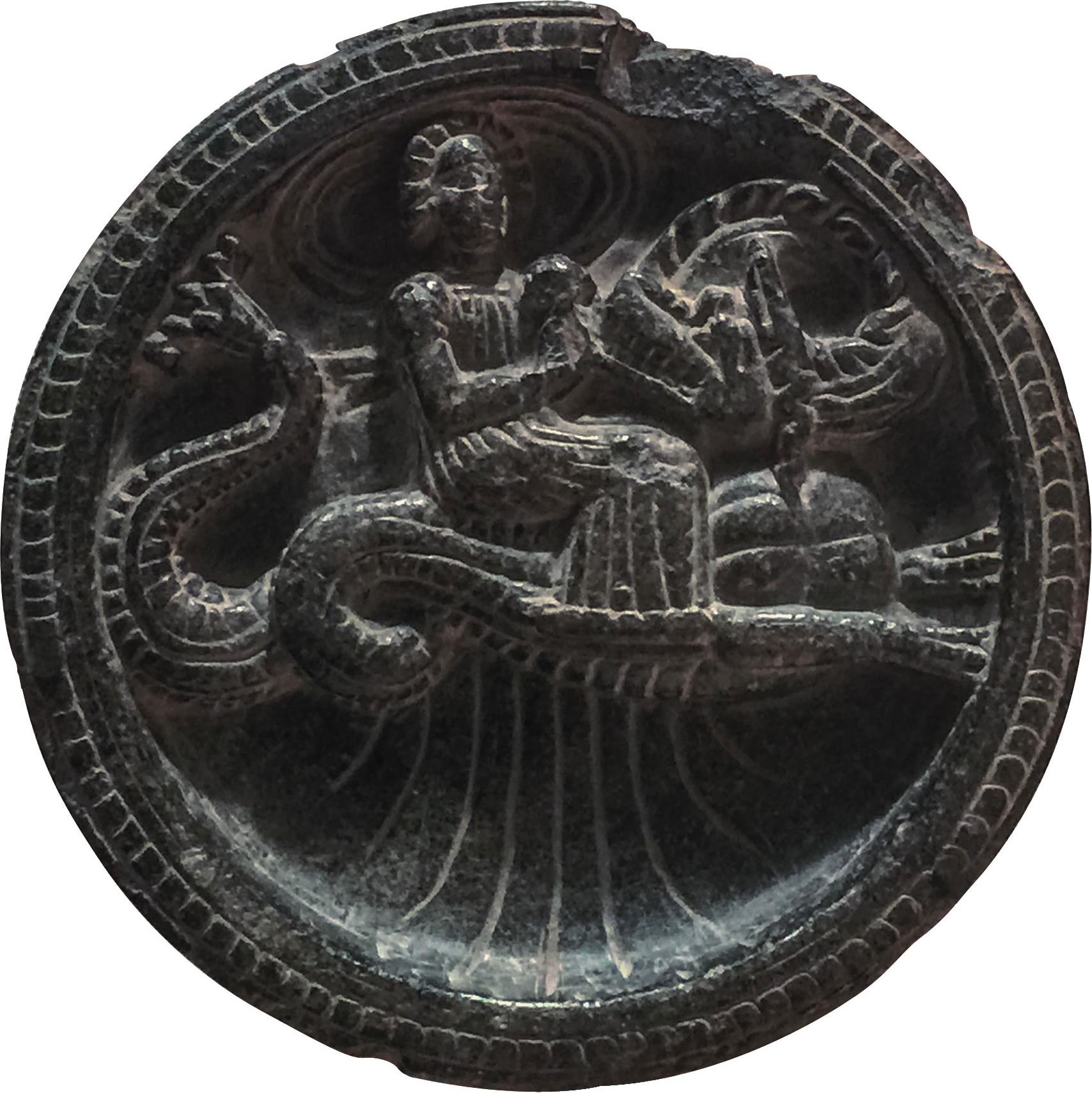 除了人物像之外,装饰盘常常出现海兽的形象,比如尼尔尤斯(Nereus)的女儿海宁芙(Nereid)骑乘各种海兽。希腊文化传入犍陀罗不光经过陆地,也跟海上贸易有关系。在犍陀罗装饰盘上,可以看到海神波塞冬的形象。