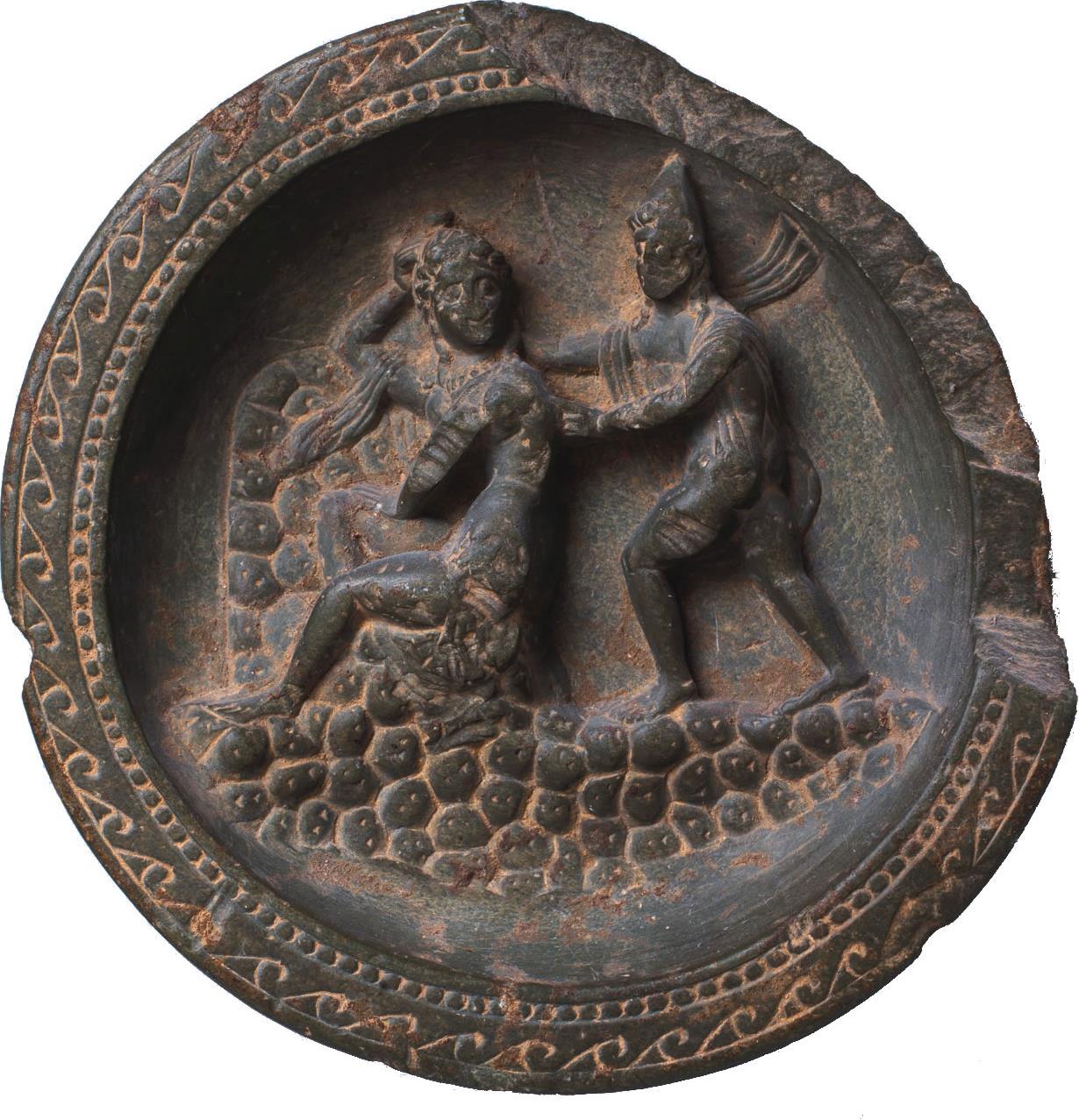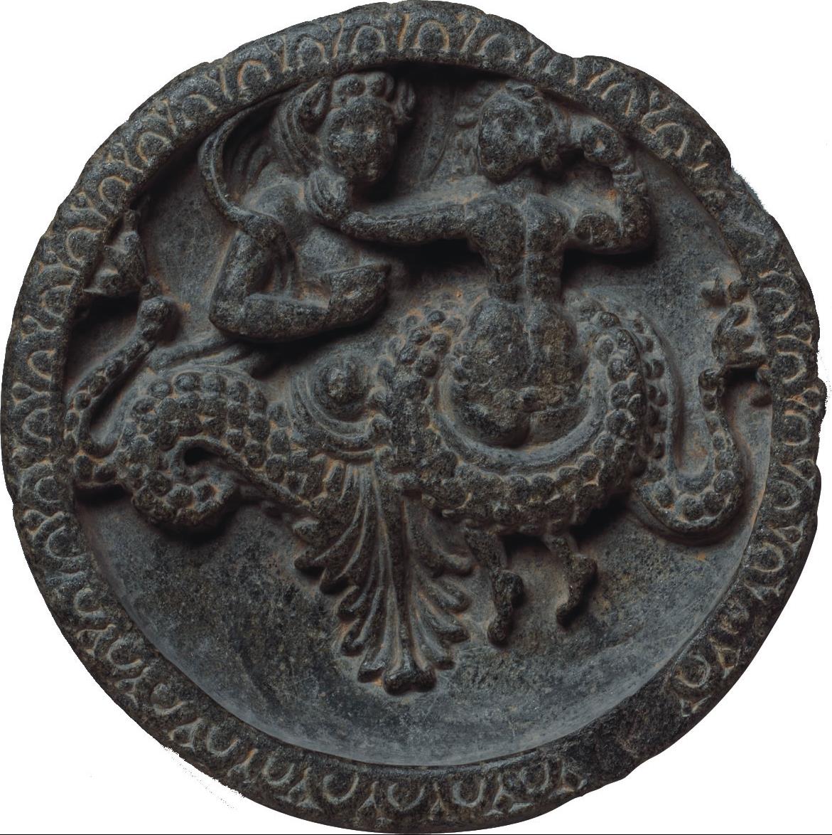 这些充满希腊文化色彩的装饰盘,一般直径在10—20厘米,材质包括片岩等,周边凸起,中间凹入,中间部分雕刻浮雕——几乎都是人物或者动物浮雕。有的全部雕刻,有的只雕刻四分之三或者一半的凹面,剩下的留白,有的简单用几何纹和莲花纹装饰。这些装饰盘呈现一种世界主义的精神面貌。在这些装饰盘上雕刻的,有乘海兽的人物,有喝醉的酒神狄俄尼索斯和大力士赫拉克勒斯,有阿波罗追求达芙妮的场景,有死者的飨宴,等等。