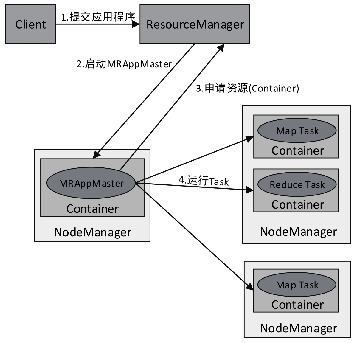 图5-3所示为MapReduce应用程序在YARN中的执行流程。