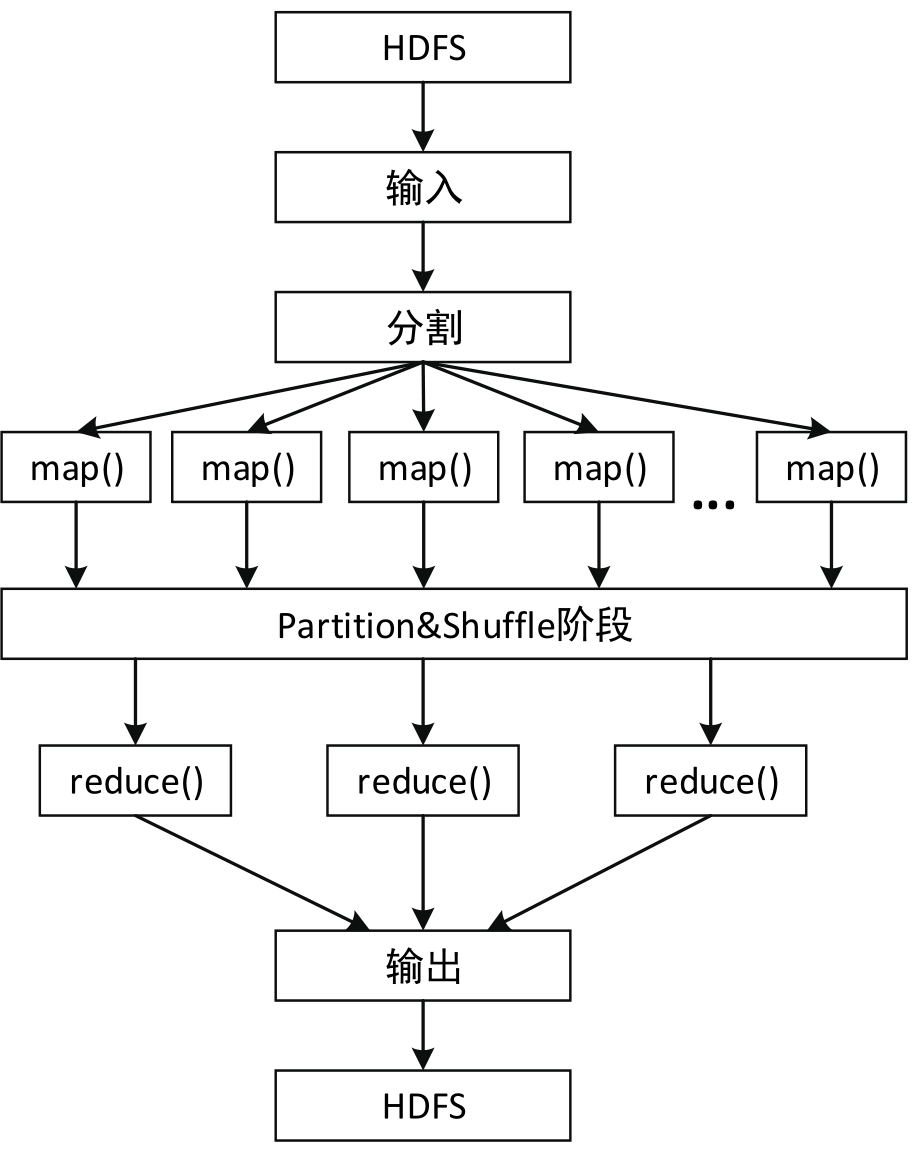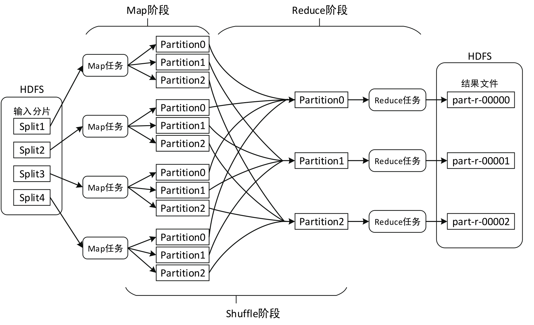 MapReduce计算模型主要由三个阶段组成:Map阶段、Shuffle阶段、Reduce阶段,如图5-4所示。