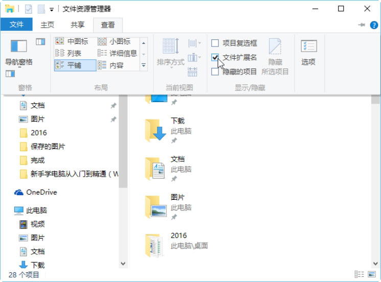 Step 02 选择“查看”选项卡,在打开的功能区域中选中“显示/隐藏”区域的“文件扩展名”复选框,如下图所示。