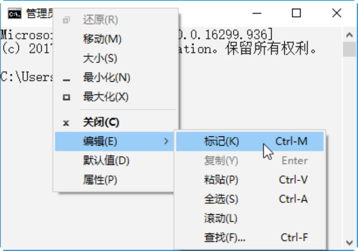 Step 01 右击“命令提示符”窗口标题栏,将弹出一个快捷菜单。在这里可以对当前窗口进行各种操作,如移动、最大化、最小化、编辑等。选择此菜单中的“编辑”命令,在显示的子菜单中选择“标记”选项,如下图所示。