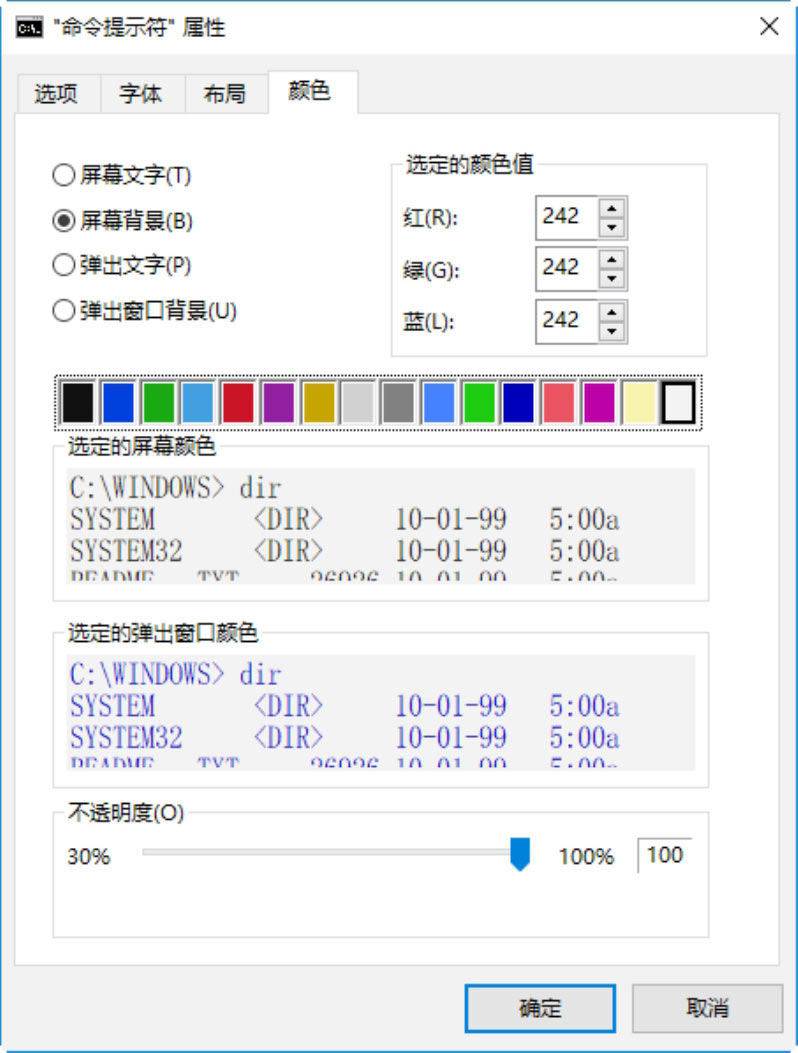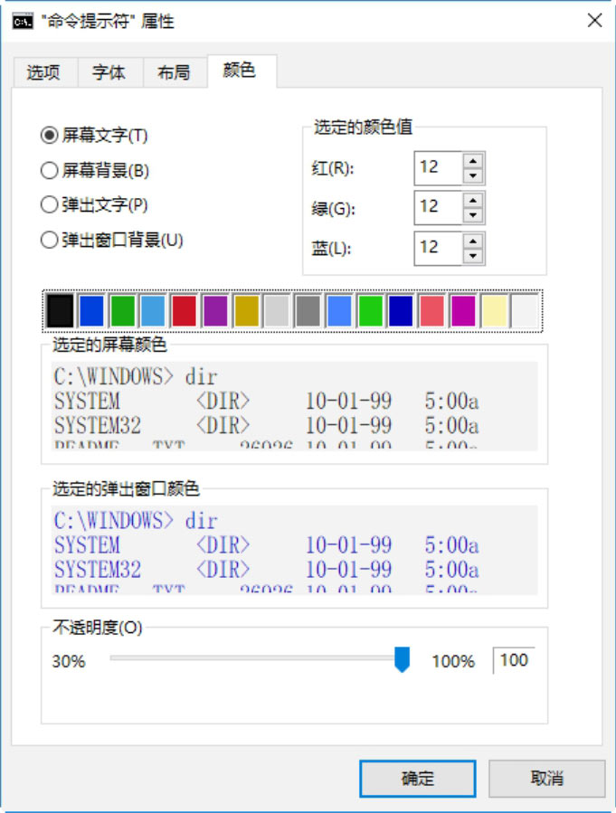 在“‘命令提示符’属性”对话框中的“颜色”选项卡下可以对命令行“屏幕文字”“屏幕背景”“弹出文字”“弹出窗口背景”的颜色进行设置,具体的操作步骤如下。