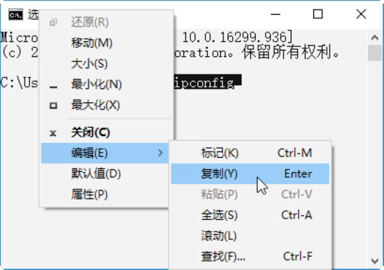 Step 02 移动光标,选择要复制的内容,可以直接按Enter键复制该命令行,也可以通过选择“编辑”→“复制”菜单项来实现,如下图所示。