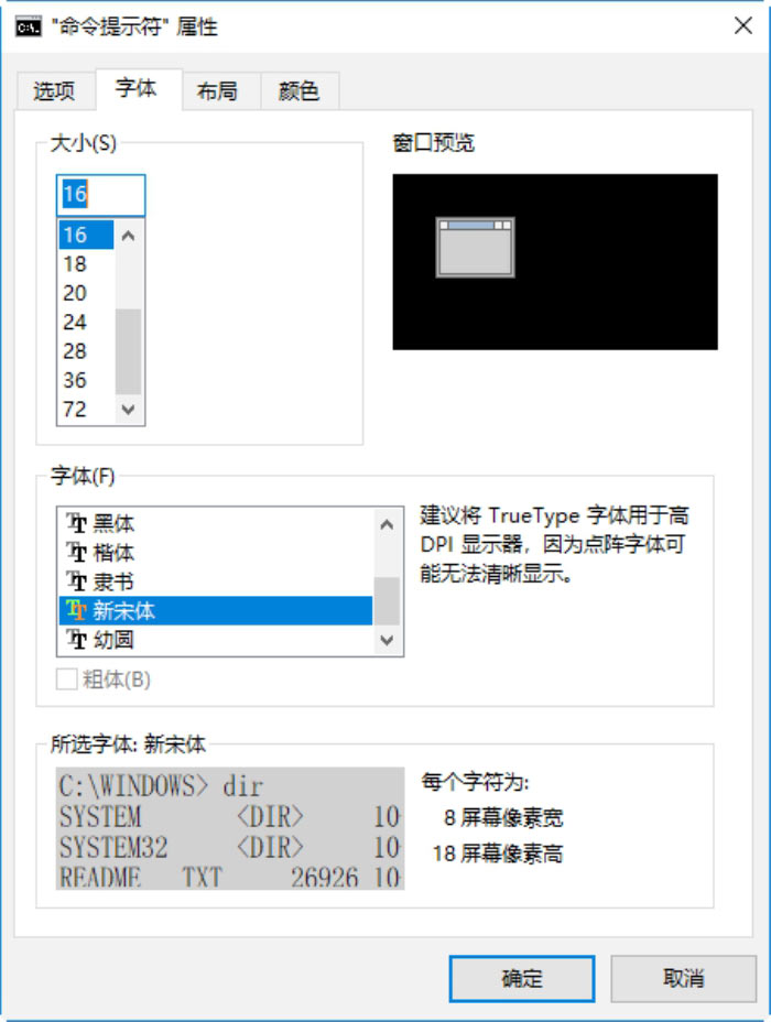 在“‘命令提示符’属性”对话框中选择“字体”选项卡,在其中设置字体的样式,并可以选择窗口的大小,如下图所示。