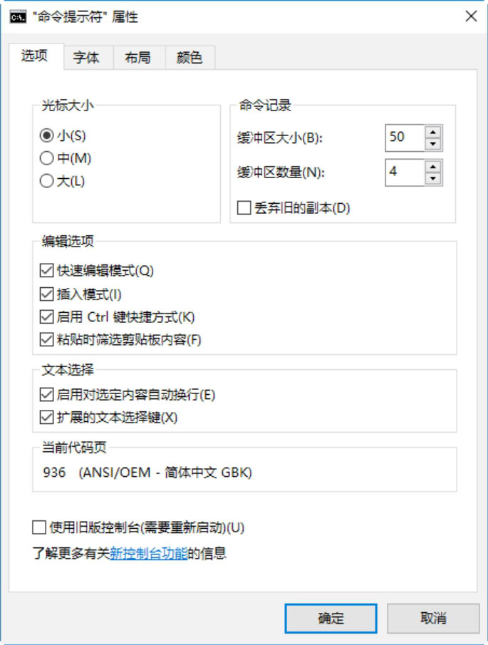 在“‘命令提示符’属性”对话框中选择“选项”选项卡,在这里可以设置光标大小、命令记录格式等,在“编辑选项”栏,如果选中“快速编辑模式”复选框,那么在窗口中随时可以对命令行进行编辑,如下图所示。
