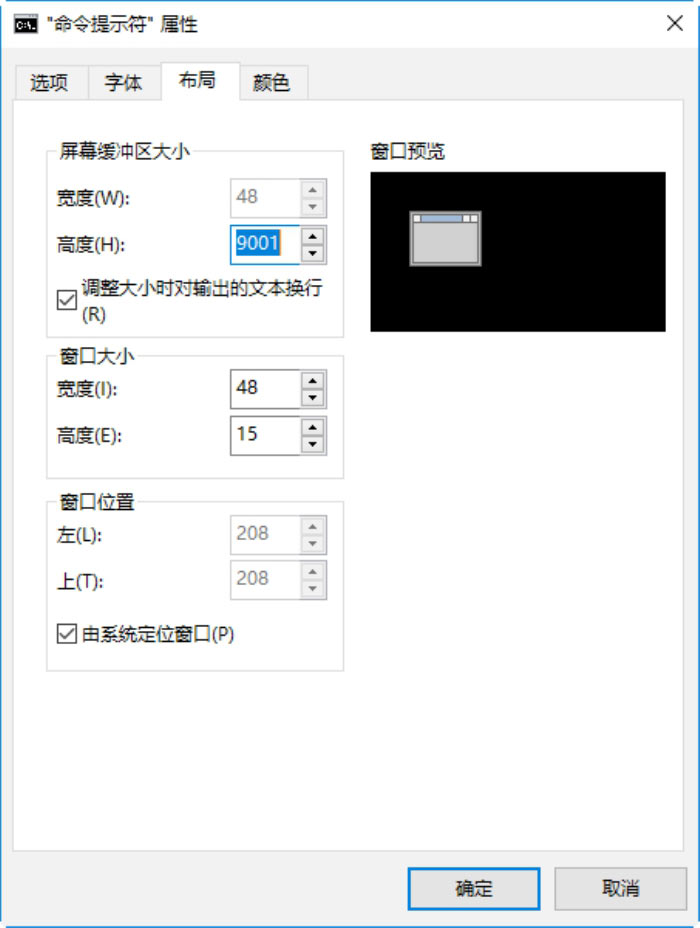 在“‘命令提示符’属性”对话框中选择“布局”选项卡,在这里可以对窗口进行整体布局设置,可以具体设置窗口的大小、在屏幕中所处的位置以及屏幕缓冲区大小。在设置窗口位置时,如果选中“由系统定位窗口”复选框,那么在启动DOS时,窗口在屏幕中所处的位置由系统来决定,如下图所示。