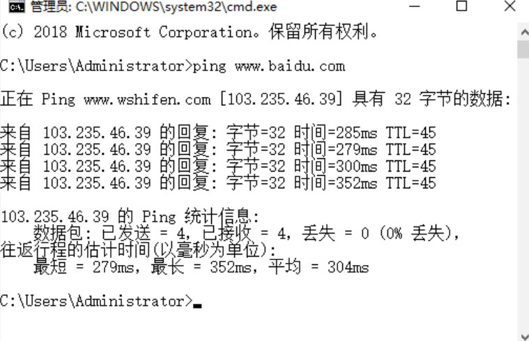 Step 03 判断本台计算机是否与外界网络连通。在“命令提示符”窗口中输入ping www.baidu.com命令,其运行结果如下图所示,图中说明本台计算机与外界网络连通。