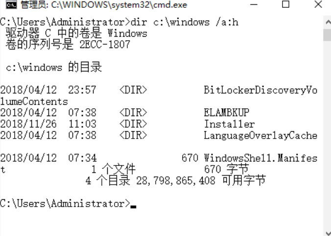Step 03 在“命令提示符”窗口中输入dir c:\windows /a:h命令,按Enter键,即可列出c:\windows目录下的隐藏文件,如下图所示。