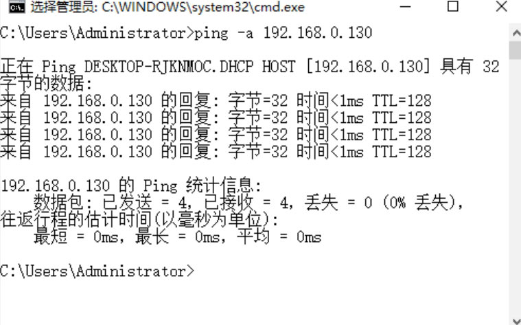 Step 04 解析某IP地址的计算机名。在“命令提示符”窗口中输入ping -a 192.168.0.130命令,其运行结果如下图所示,可知这台主机的名称为DESKTOP-RJKNMOC。