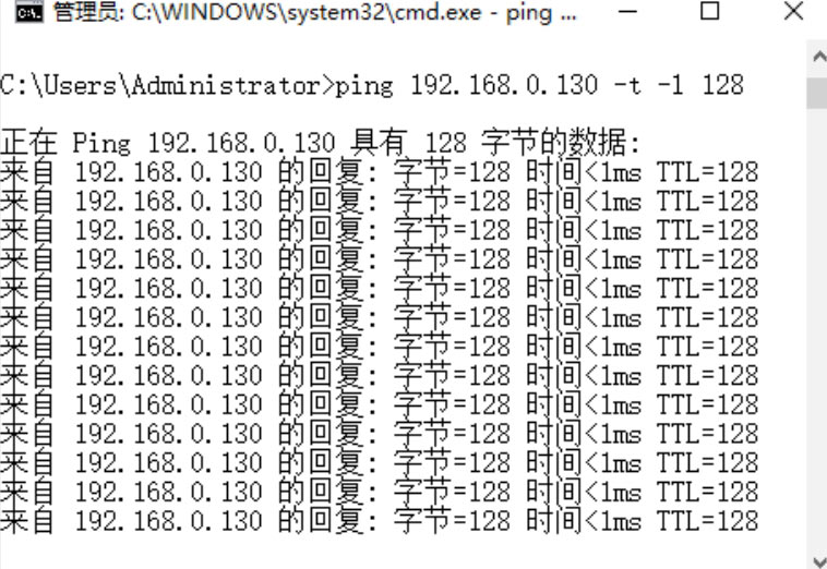 Step 02 在“命令提示符”窗口中输入ping 192.168.0.130-t-l 128命令,可以不断向某台主机发出大量的数据包,如下图所示。