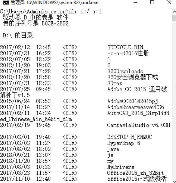 Step 02 在“命令提示符”窗口中输入dir d:/ a:d命令,按Enter键,即可查看D盘下的所有文件的目录,如下图所示。