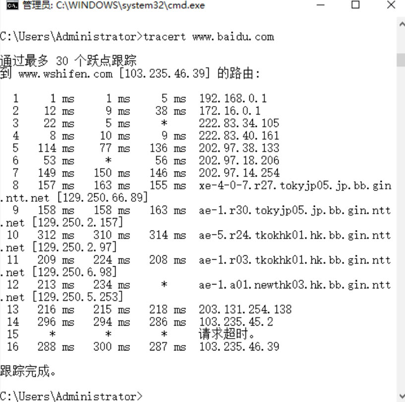 例如,如果想查看www.baidu.com的路由与局域网络连接情况,则在“命令提示符”窗口中输入tracert www.baidu.com命令,按Enter键,其显示结果如下图所示。