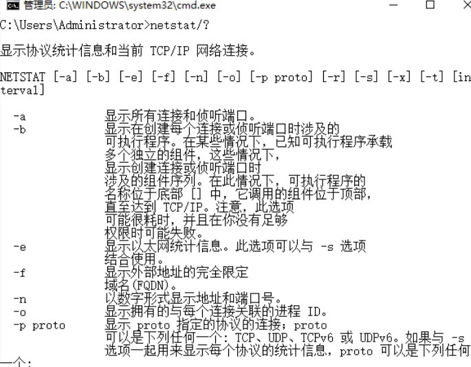 在“命令提示符”窗口中输入netstat/?命令,可以得到这条命令的帮助信息。