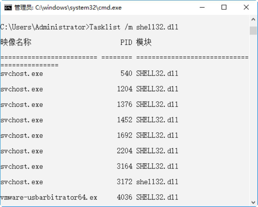 Step 03 如果要查看本地系统中哪些进程调用了shell32.dll模块文件,用户可以在“命令提示符”窗口中输入Tasklist /m shell32.dll,按Enter键,即可显示这些进程的列表。