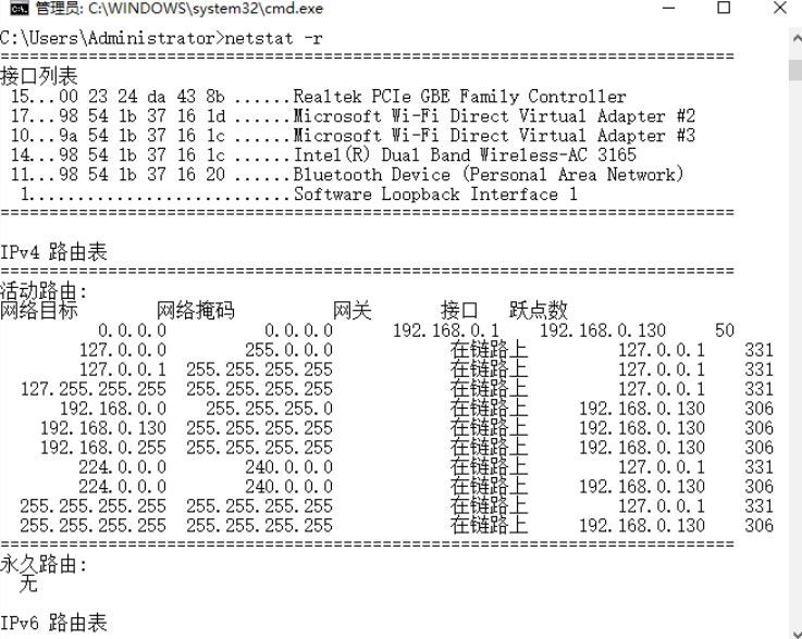 Step 02 在“命令提示符”窗口中输入netstat-r命令,按Enter键,即可查看本机的路由信息,如下图所示。