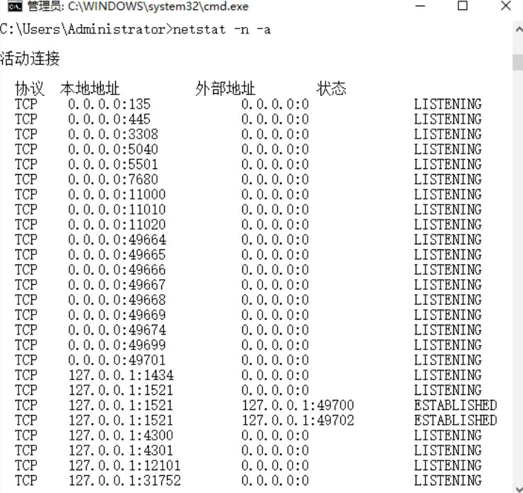 Step 04 在“命令提示符”窗口中输入netstat-n -a命令,按Enter键,即可显示本机所有连接的端口及其状态,如下图所示。