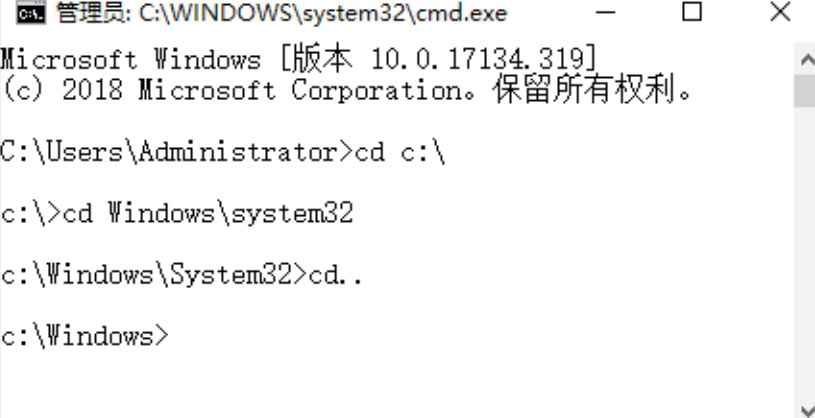 (2)cd..:cd后面的两个“.”表示返回上一级目录,如当前的目录为C:\Windows,如果输入cd..命令,按Enter键即可返回上一级目录,即C:\。