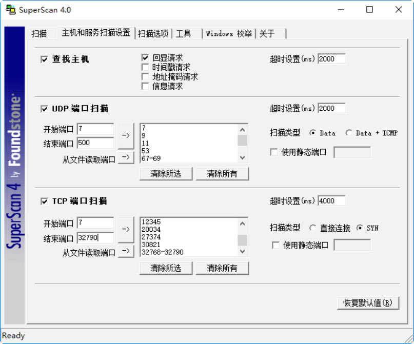Step 02 启动SuperScan程序,然后切换到“主机和服务器扫描设置”选项卡,在其中对想要扫描的UDP和TCP端口进行设置,如下图所示。