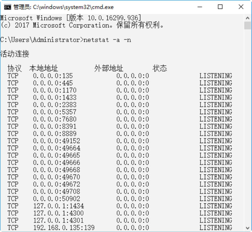 Step 01 在“命令提示符”窗口中输入netstat-a -n命令,按Enter键,即可查看本机开启的端口,在运行结果中可以看到以数字形式显示的TCP和UDP连接的端口号及其状态,如下图所示。