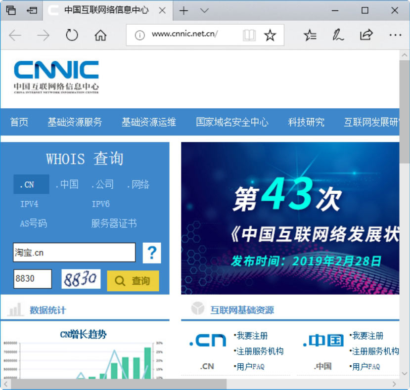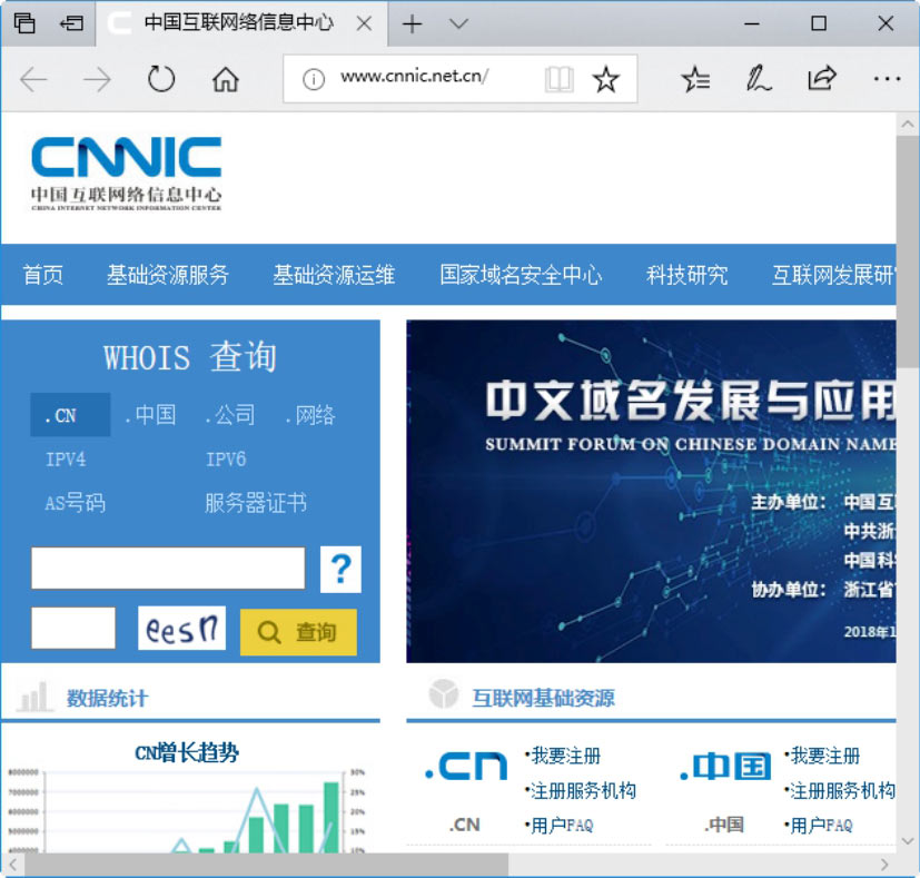 Step 01 在Microsoft Edge浏览器的地址栏中输入中国互联网信息中心的网址http://www.cnnic.net.cn/,即可打开查询页面,如下图所示。