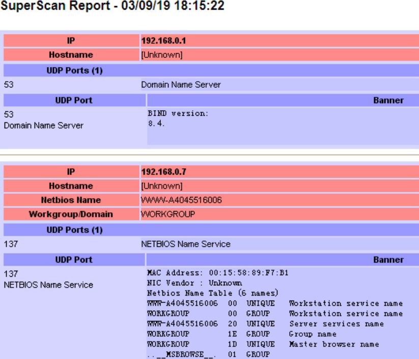 Step 05 SuperScan还有选择以HTML格式显示信息的功能。单击“查看HTML结果”按钮,即可显示扫描了哪些主机和在每台主机上哪些端口是开放的,并生成一份HTML的报告,如下图所示。
