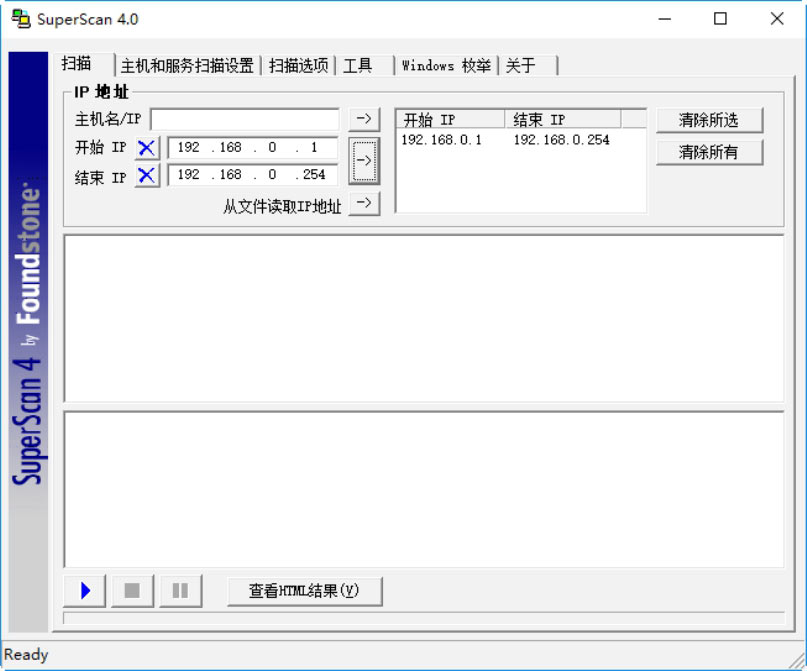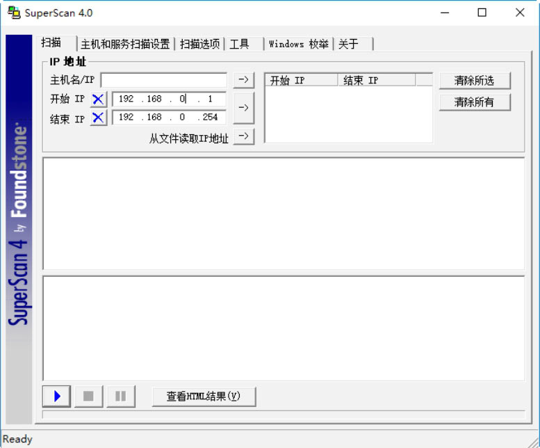 Step 01 双击下载的SuperScan可执行文件,打开SuperScan操作界面,在“扫描”选项卡的“IP地址”栏目中输入开始IP和结束IP,如下图所示。